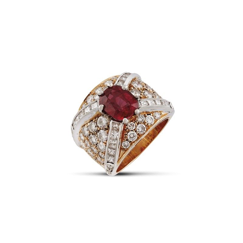 ANELLO AD AMPIA FASCIA CON RUBINO E DIAMANTI in oro giallo e bianco 18kt, impreziosito al centro da un rubino taglio ovale (smontato) di ct 3.26, circondato da diamanti taglio princess e brillante per ct 2.80 circa, mis. 15/55, gr. 15. Corredato di certificato (duplicato) IGN del 30/10/2015 attestante le caratteristiche.
