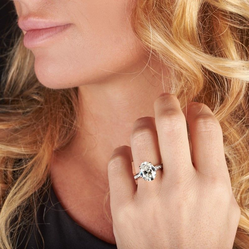 ANELLO CON DIAMANTE in oro bianco 18kt, al centro un diamante taglio ovale di ct 5.04, colore G, purezza SI2, sulla fascia una fila di diamanti taglio brillante per ct 0.60 circa, punzoni 750 e del fabbricante, mis. 13, gr. 4. Corredato di certificato IGN (duplicato) del 11/12/2020 attestante le caratteristiche della pietra centrale.