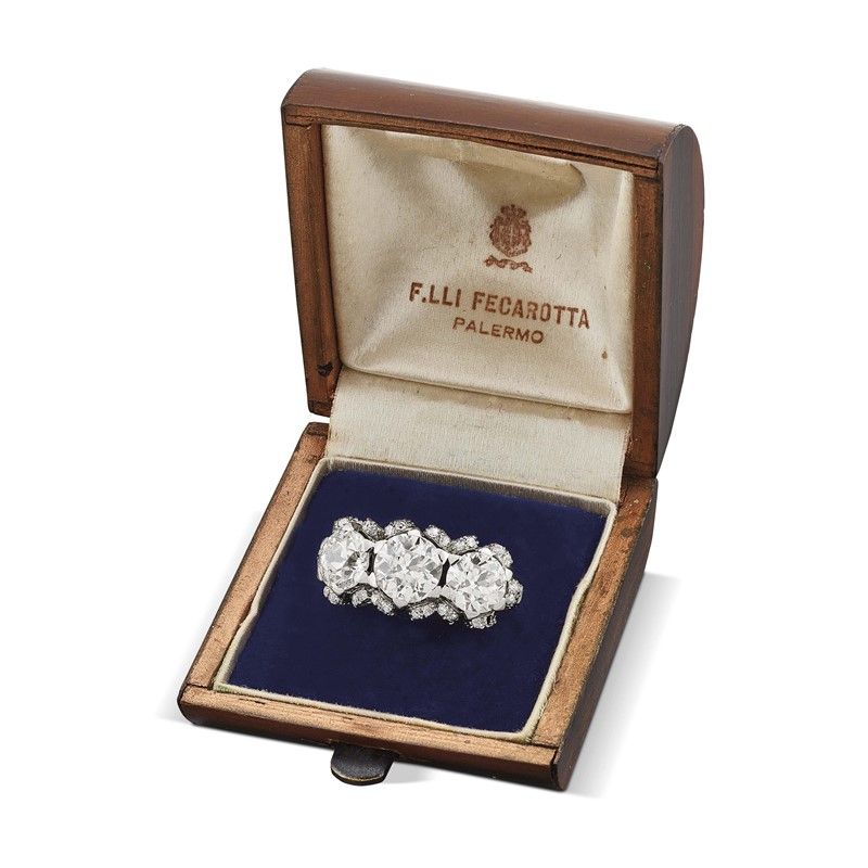 ANELLO CON DIAMANTI in oro bianco 18kt, impreziosito al centro da un diamante taglio vecchio di ct 1.80 circa affiancato da due diamanti taglio vecchio per ct 3 circa, circondato da piccoli diamanti taglio huit huit (uno mancante) per ct 0.30 circa, mis. 15/55, gr. 5