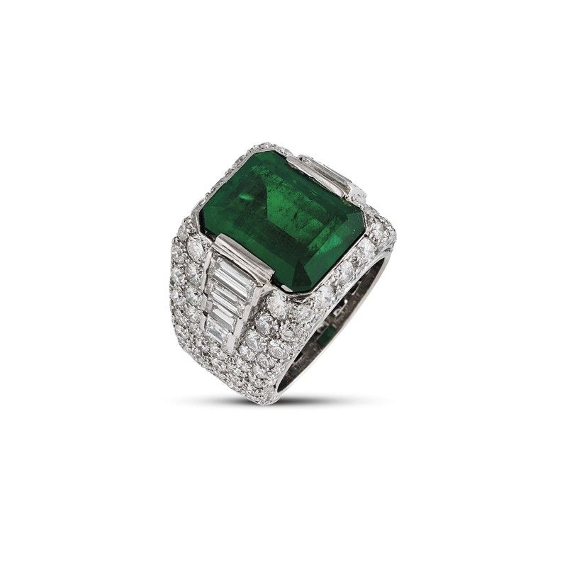 ANELLO CON GRANDE SMERALDO COLOMBIANO E DIAMANTI in oro bianco 18kt, al centro uno smeraldo colombiano "minor enhancement" taglio ottagonale di ct 8.41, circondato da diamanti taglio baguette e brillante per ct 5 circa, mis. 14/54, gr. 14. Corredato di certificato Gubelin del 16/03/2016 attestante le caratteristiche e l'origine geografica della pietra.