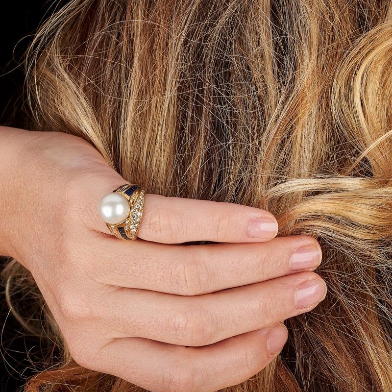 ANELLO CON PERLA ZAFFIRI E DIAMANTI in oro giallo 18kt, al centro una perla di mm 11 circa circondata da zaffiri taglio baguette per ct 0.50 circa e diamanti taglio baguette e brillante per ct 1.10 circa, mis. 9/49, gr. 11