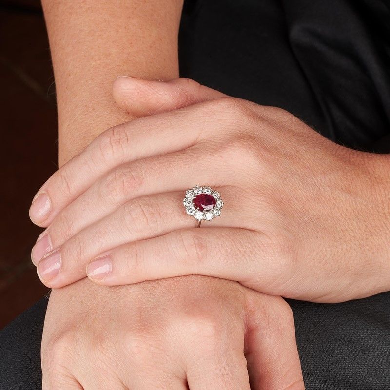 ANELLO CON RUBINO BIRMANO E DIAMANTI in oro bianco 18kt, al centro un rubino birmano taglio ovale di ct 1.60 circa, circondato da una fila di diamanti taglio brillante per ct 1.50 circa, mis. 15/55, gr. 4. Corredato di certificato IGN del 16/10/2023 attestante l'assenza di trattamenti termici e l'origine della pietra.