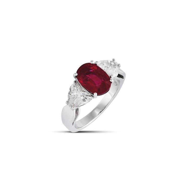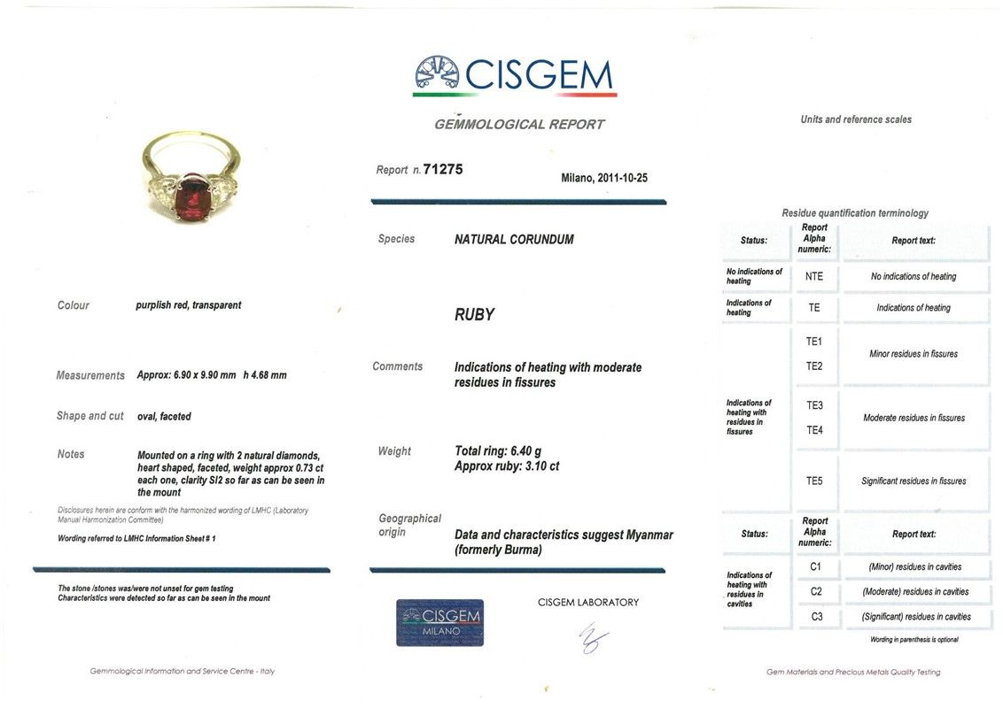 ANELLO CON RUBINO BIRMANO E DIAMANTI in oro bianco 18kt, al centro un rubino birmano taglio ovale di ct 3.10, affiancato da due diamanti taglio a cuore per ct 1.40 circa, punzone 750, mis. 13/53, gr. 6. Corredato di certificato CISGEM del 25/10/2011 attestante le caratteristiche e l'origine geografica della pietra.