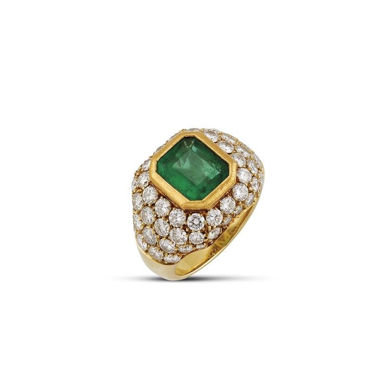 in oro giallo 18kt, impreziosito al centro da uno smeraldo di ct 2.60 circa, circondato da pavé di diamanti taglio brillante per ct 1.60 circa, mis. 14/54, gr. 11