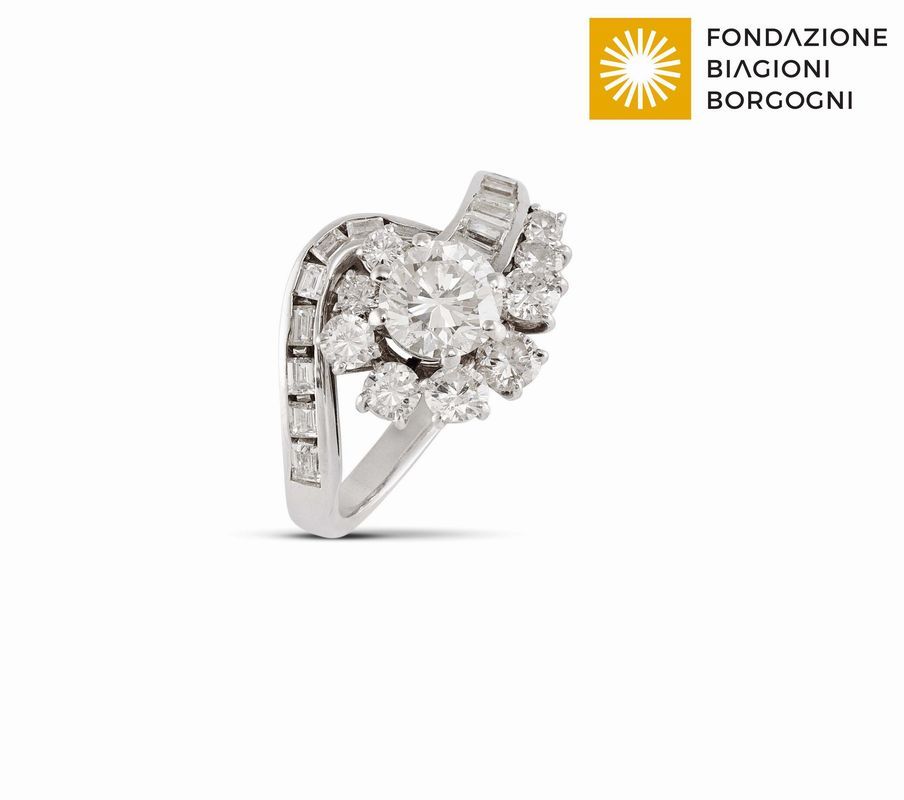 in oro bianco 18kt, impreziosito da un diamante centrale di ct 0.90 circa affiancato da diamanti taglio brillante e baguette per ct 1.20 circa, punzone 750, mis. 14/54, gr. 5