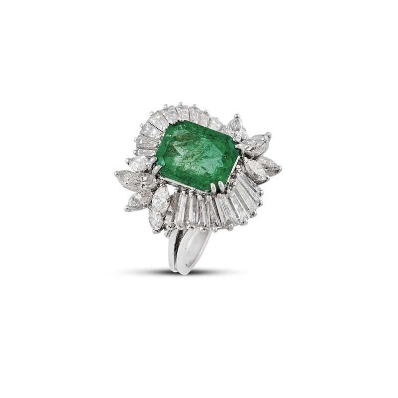 in platino, impreziosito al centro da uno smeraldo taglio ottagonale di ct 3.20 circa, circondato da diamanti taglio navette e tapes per ct 2 circa, punzoni PT900 e del fabbricante, mis. 12/52, gr. 9