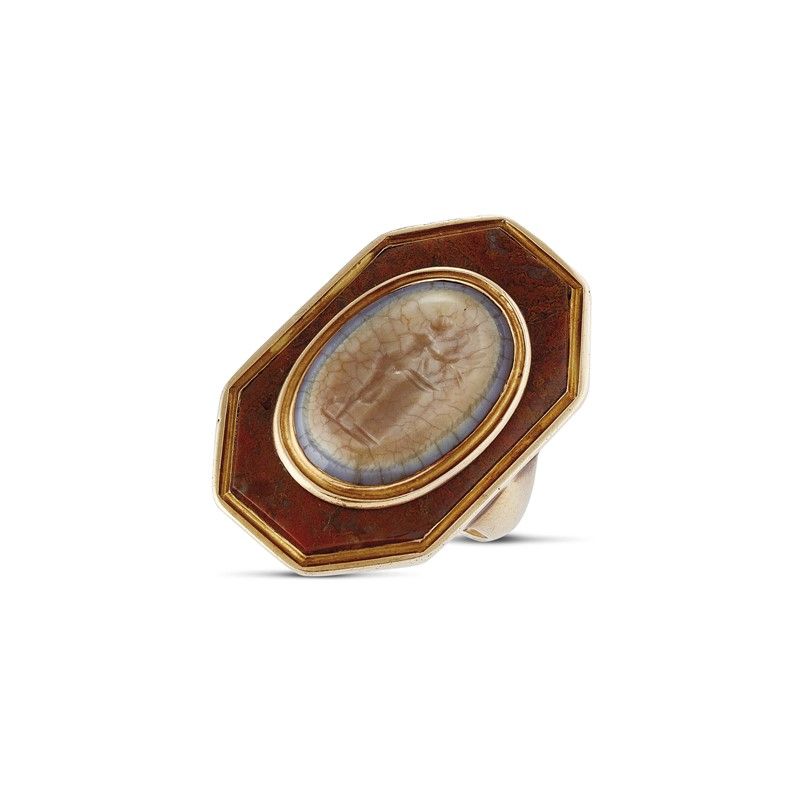 in oro giallo 18kt, composto da parti in corniola con incisa al centro la scena mitologica di "Leda e il cigno", mis. 11/51, gr. 9