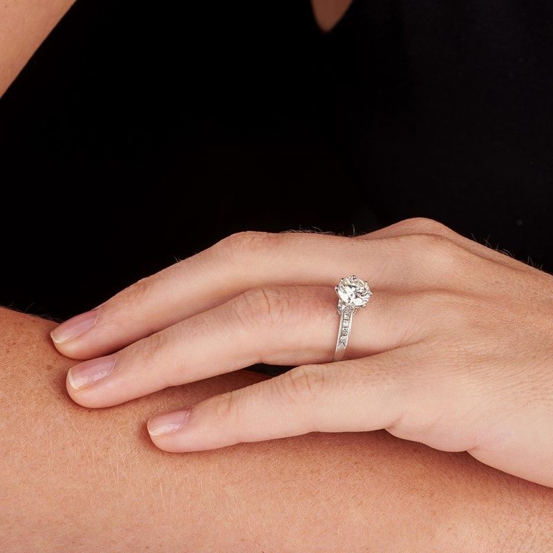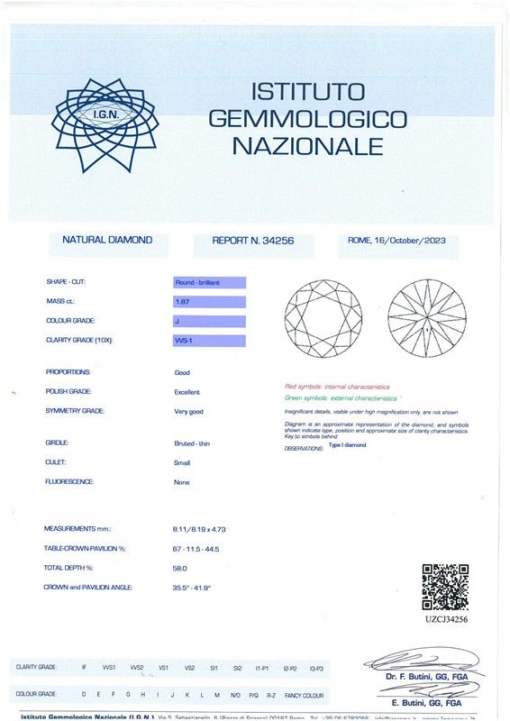 ANELLO SOLITARIO in oro bianco 18kt, al centro un diamante taglio brillante (smontato) di ct 1.87, affiancato da piccoli diamanti taglio huit huit, punzoni 750 e del fabbricante, mis. 16/56, gr. 3. Corredato di certificato IGN del 16/10/2023 attestante le caratteristiche.
