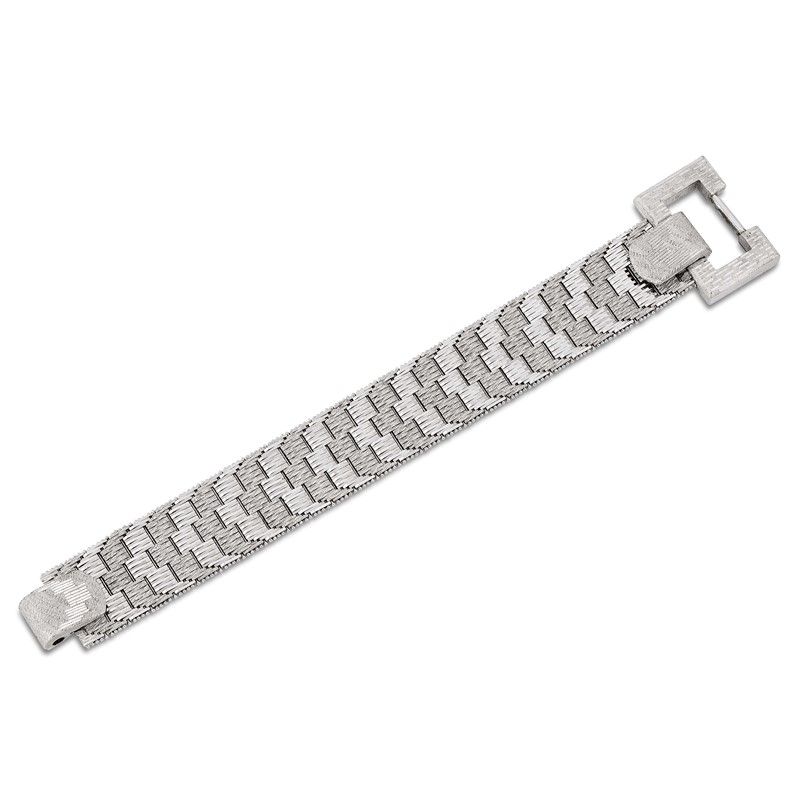in oro bianco 18kt, realizzato a maglia morbida con segmenti lucidi alternati a parti satinate, punzoni 750 e del fbbricante, lungh. cm 19, gr. 96