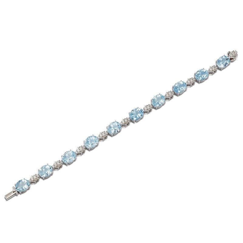 BRACCIALE CON ACQUAMARINE E DIAMANTI in oro bianco 18kt, impreziosito da una fila di acquamarine taglio ovale per ct 23 circa alternate a diamanti taglio brillante per ct 0.80 circa, punzone 750, lungh. cm 18, gr. 21