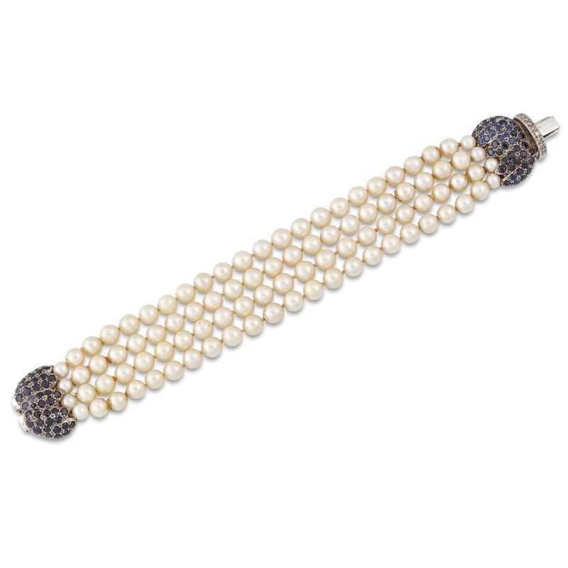 composto da quattro fili di perle di mm 6 circa, fermatura in oro bianco 18kt impreziosita da zaffiri taglio rotondo per ct 4 circa, lungh. cm 18, gr. 48