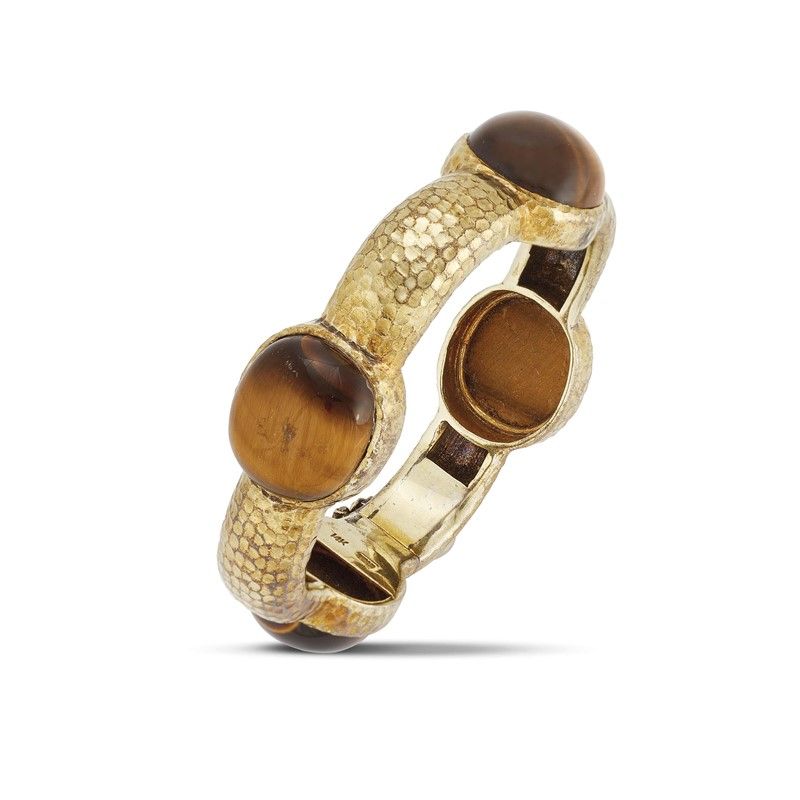 in oro 14kt martellato, di forma quadrangolare, recante su ciascun lato occhi di tigre taglio cabochon di mm 17x19x8 circa, punzoni 14kt e del fabbricante, dim. cm 7,5x7,5, diam. interno cm 5. gr. 87