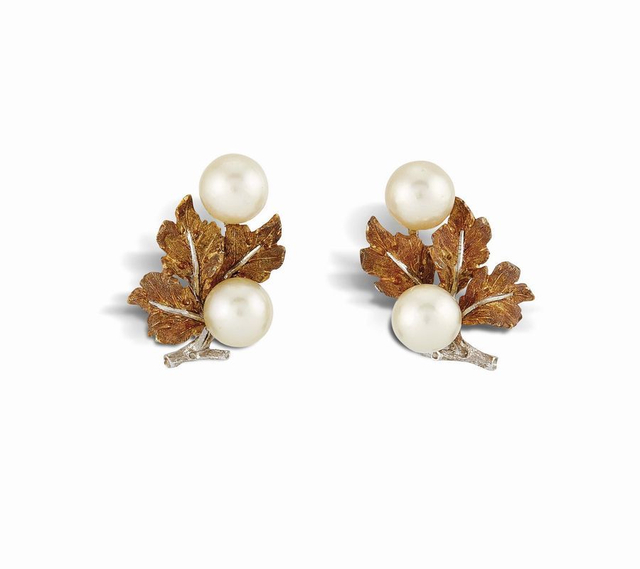 BUCCELLATI PAIO DI ORECCHINI CON PERLE in oro giallo e bianco satinato 18kt, realizzato a forma di tralci, impreziositi da quattro perle di mm 8 circa, firmati "Buccellati", chiusura a clip, dim. cm 2x2, gr. 12 complessivi
