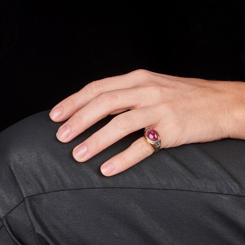 BULGARI ANELLO CON RUBINO E DIAMANTI in oro giallo 18kt e platino, al centro un rubino taglio cabochon di ct 7.59, affiancato da due diamanti taglio baguette per ct 1.10 circa, firmato "Bulgari", punzoni 750 e del fabbricante, mis. 8/48, gr. 16