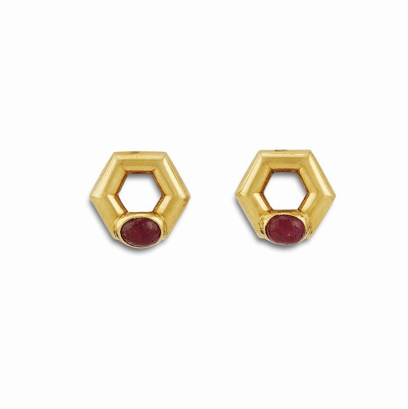 BULGARI PAIO DI ORECCHINI GEOMETRICI CON RUBINI in oro giallo 18kt, di forma esagonale e impreziositi da due rubini taglio cabochon per ct 2.60 circa, firmati "Bulgari", punzone 750, chiusura a clip, dim. cm 1,5x1,5, gr. 11 complessivi