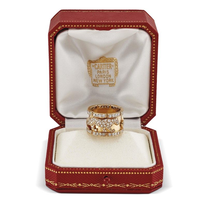in oro giallo 18kt, realizzato ad ampia fascia, con raffigurate due pantere impreziosite da diamanti taglio brillante per ct 2.30 circa, firmato "Cartier", punzone 750 e n. seriale, mis. 13/53, gr. 12. Corredato di scatola.