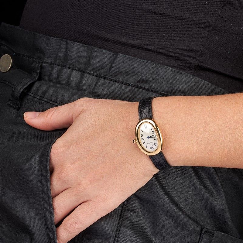 cassa di forma ovale in oro giallo 18kt, fondello serrato con viti, corona con zaffiro cabochon, lunetta liscia in oro giallo 18kt, quadrante avorio firmato Cartier, grafica nera, numeri romani, movimento al quarzo, cinturino in pelle nera, lungh. interna cm 18, chiusura deployant in oro giallo 18kt firmata Cartier, vetro minerale, gr. complessivi 38. Dim. mm 22x31
