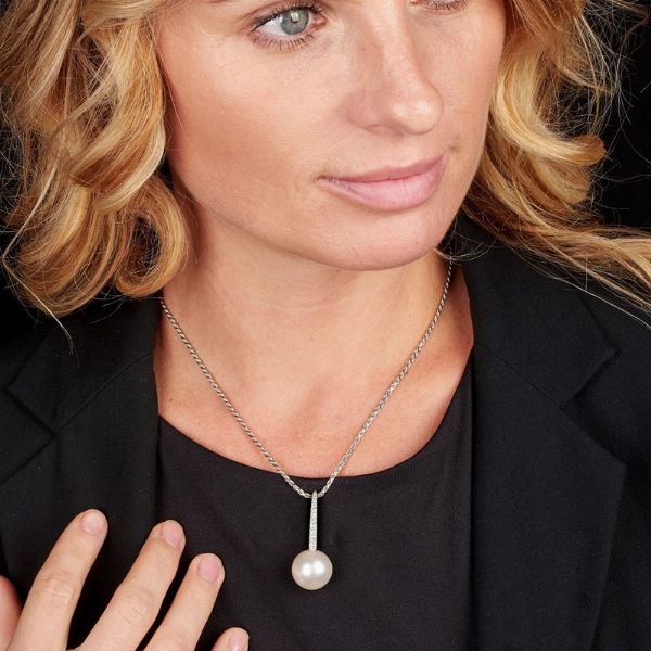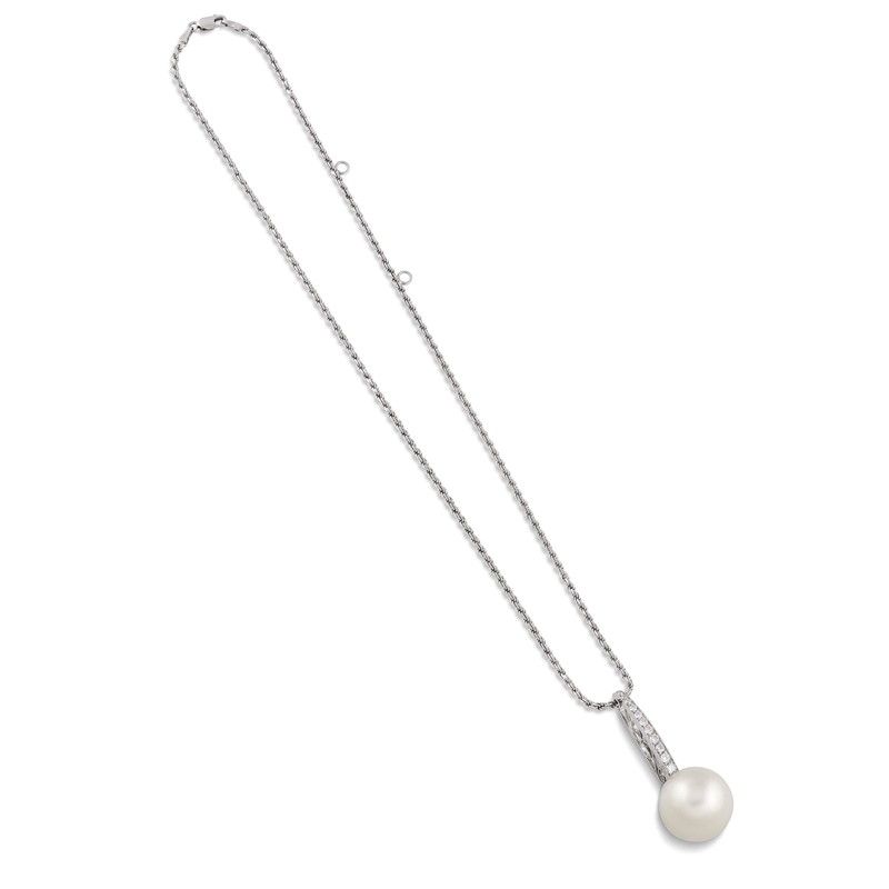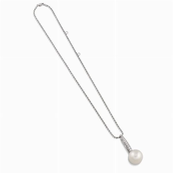 COLLANA CON PERLA SOUTH SEA E DIAMANTI in oro bianco 18kt, composta da catena e pendente con diamanti taglio brillante per ct 0.35 circa e una perla south sea di mm 16 circa, punzoni 750 e del fabbricante, lungh. cm 45, dim. pendente cm 1,5x4 circa, gr. 17