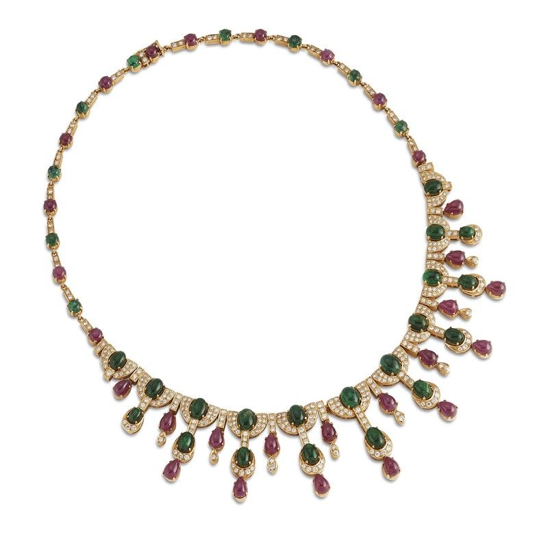 COLLANA CON SMERALDI RUBINI E DIAMANTI in oro giallo 18kt, impreziosita da smeraldi taglio cabochon per ct 18 circa, rubini taglio cabochon per ct 21 circa e diamanti taglio brillante per ct 3.70 circa, punzone 18kt, lungh. cm 44, gr. 70