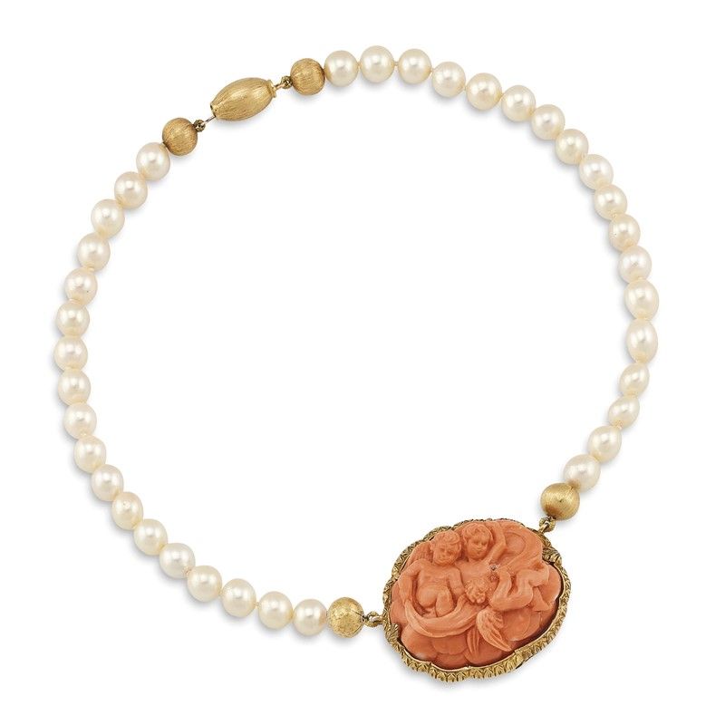 composta da un filo di perle di mm 7 circa, fermatura ed elemento centrale in oro giallo satinato 18kt con corallo inciso raffigurante degli angeli in volo, punzoni 750 e del fabbricante, lungh. cm 38, gr. 47