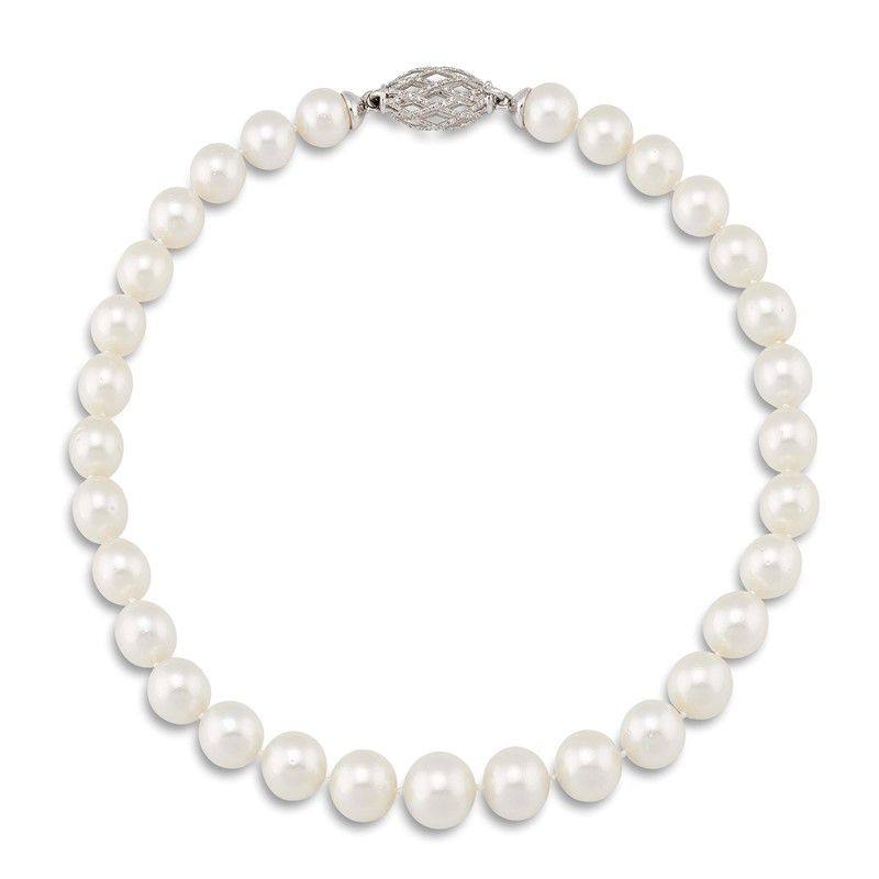 composta da un filo di perle leggermente digradanti di mm 15-13 circa, fermatura in oro bianco 18kt impreziosita da piccoli diamanti taglio brillante, lungh. cm 50, gr. 123