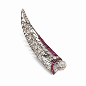 SPILLA A FORMA DI PIUMA CON RUBINI E DIAMANTI in platino, impreziosita diamanti taglio vecchio per ct 0.90 circa, [..]