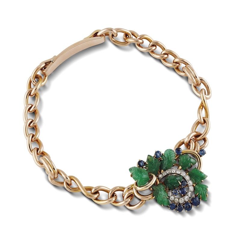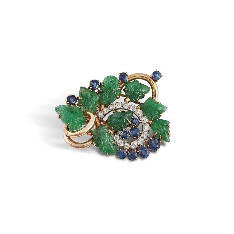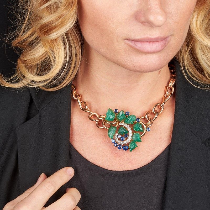 MAUBOUSSIN COLLANA A CATENA CON PIETRE DI COLORE E DIAMANTI in oro rosa 18kt, composta da una serie di maglie concatenate, unite al centro da una spilla amovibile a forma di tralcio con foglie in smeraldi incisi, zaffiri taglio rotondo per ct 5 circa e diamanti taglio vecchio per ct 2.40 circa, firmata "Mauboussin", punzoni francesi dell'oro, del fabbricante e n. seriale, lungh. cm 39, gr. 110