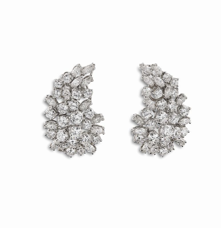 in oro bianco 18kt, impreziositi da diamanti taglio brillante e navette per ct 7 circa, chiusura a clip, punzone 18kt, dim. cm 2x3 circa, gr. 14 complessivi