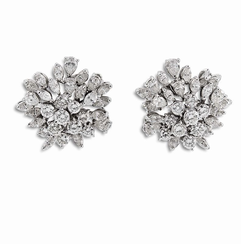 in oro bianco 18kt, impreziositi da diamanti taglio brillante, navette e a goccia per ct 6 circa, punzoni 750 e del fabbricante, chiusura a clip con perno, dim. cm 2,2,5 circa, gr. 21 complessivi