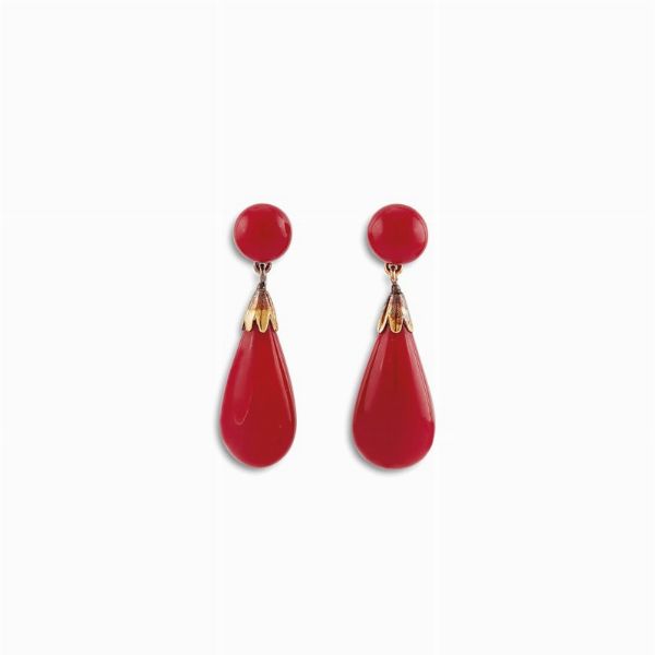 in oro 14kt, impreziositi da boules e gocce in corallo rosso, chiusura a vite, lungh. cm 1,5x4,5, gr. 17 complessivi