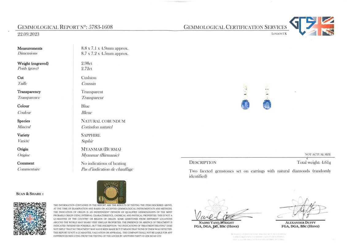 PAIO DI ORECCHINI PENDENTI CON ZAFFIRI BIRMANI E DIAMANTI in oro bianco 18kt, impreziositi da due zaffiri birmani taglio cuscino di ct 2.98 e 2.72, con diamanti taglio vecchio per ct 2 circa, chiusura a farfallina, lungh. cm 2 circa, gr. 5 complessivi. Corredati di certificato GCS del 22/09/2023 attestante l'origine geografica delle pietre e l'assenza di trattamenti termici.