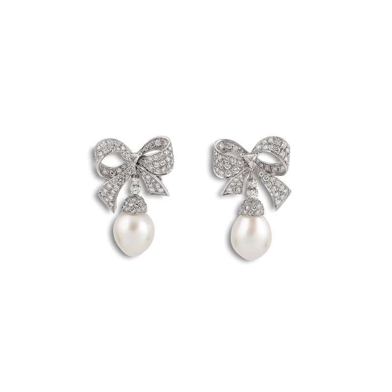 PETOCHI PAIO DI ORECCHINI A FIOCCO CON PERLE E DIAMANTI in platino, impreziositi da diamanti taglio brillante e due diamanti taglio triangolo per ct 2.80 circa, con due perle pendenti a goccia di mm 11x13 circa, chiusura a clip con perno, punzoni 950 e del fabbricante, dim. cm 2x3, gr. 21 complessivi