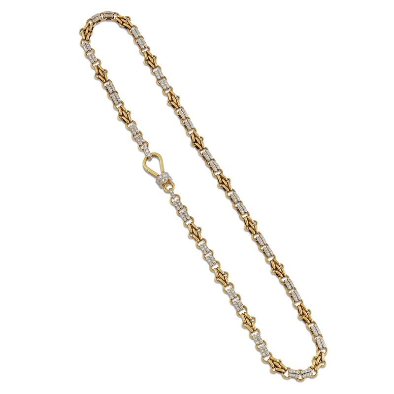 in oro giallo e bianco 18kt, distanziali impreziositi da diamanti taglio huit huit per ct 2.20 circa, firmata "Pomellato", punzoni 750 e del fabbricante, chiusura a moschettone, lungh. cm 53.5, gr. 66