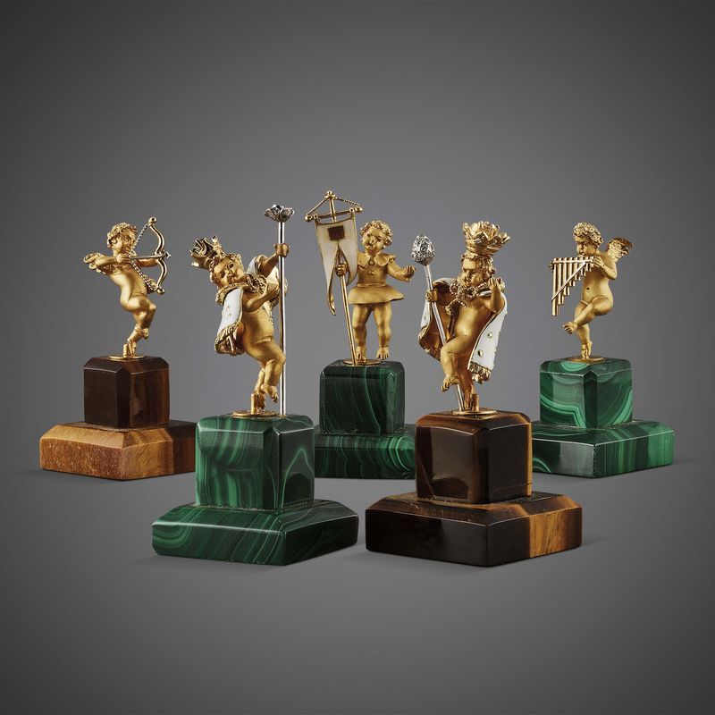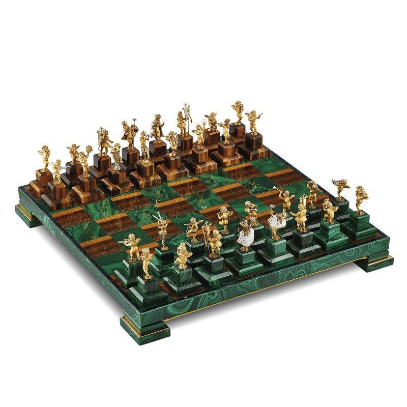 in malachite, occhio di tigre e lapislazzuli, con trentadue pezzi in oro giallo e bianco 18kt, a forma di putti alati, poggianti su basamenti in malachite e occhio di tigre, impreziositi da diamanti, dim. scacchiera cm 31x31x3,5 circa, dim. pedine cm 3x3x6 circa