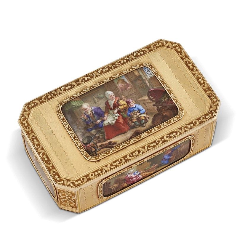 SCATOLA TABACCHIERA SECONDA METÀ XVIII in oro giallo 22kt, di forma ottagonale, la superficie è interamente incisa raffigurante un disegno decorativo guilloché, rifinita lungo tutto il profilo da fasci e ghirlande. Al centro di ogni lato, miniature in smalti policromi a loro volta incorniciate dallo stesso registro decorativo e raffiguranti con estrema maestria nature morte e scene di vita quotidiana con soggetti ripresi dall'artista Daniel Teniers il Giovane, punzoni francesi del fabbricante, marchi charge e décharge del verificatore Henry Clavel (1782-1789), dim. cm 9x5x3 circa, gr. 206. Corredata di scatola.