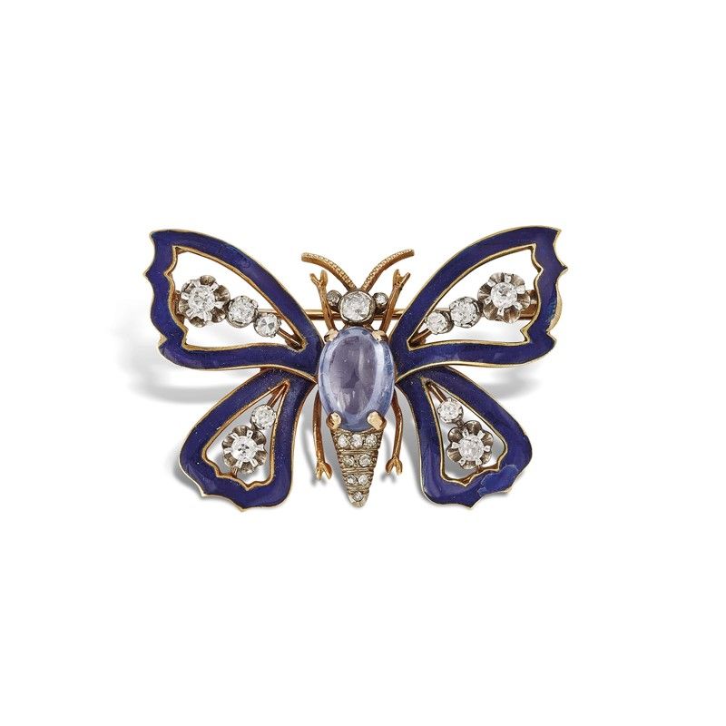 SPILLA A FORMA DI FARFALLA CON DIAMANTI in oro giallo e bianco 18kt, decorata in smalto blu, impreziosita al centro da una pietra semipreziosa taglio cabochon circondata da diamanti taglio vecchio e huit huit per ct 0.90 circa, dim. cm 4,5x3,5 circa, gr. 21