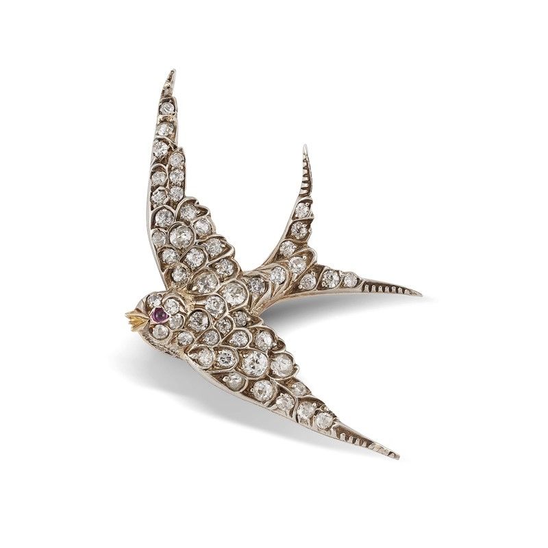 SWALLOW-SHAPED RUBY AND DIAMOND BROOCH IN GOLD AND SILVER
