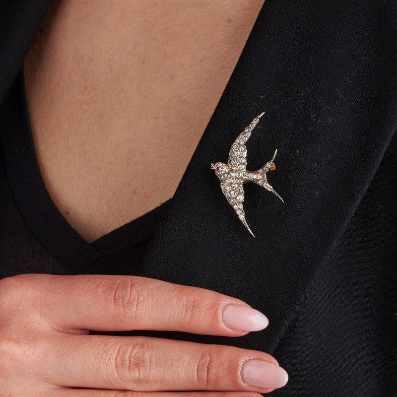 SPILLA A FORMA DI RONDINE CON RUBINO E DIAMANTI