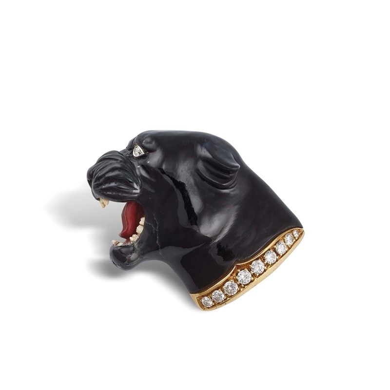 SPILLA A FORMA DI TESTA DI PANTERA in oro giallo 18kt e pietra dura (difetti), raffigurante la testa di una pantera a fauci aperte, impreziosita da diamanti taglio brillante per ct 1.20 circa, punzoni 750 e del fabbricante, dim. cm 3x4,5, gr. 41