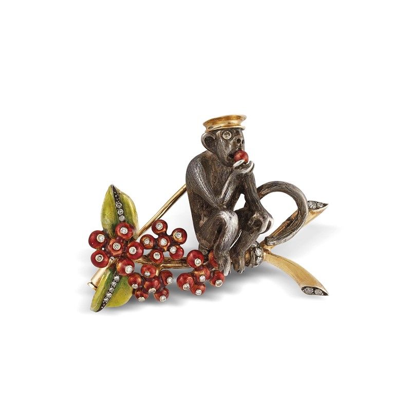 SPILLA ANIMALIER in oro giallo 18kt e metallo, decorata in smalti policromi, raffigurante una scimmia nell'atto di mangiare delle bacche rosse su un ramo, impreziosita da piccoli diamanti taglio brillante e huit huit, punzoni 750 e del fabbricante, dim. cm 4x3, gr. 19