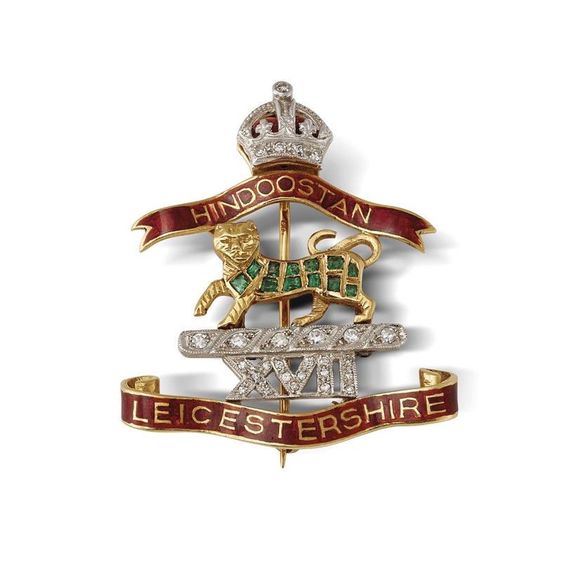 SPILLA REGIMENTAL in oro giallo e bianco 18kt, raffigurante lo stemma del reggimento dell'esercito inglese di Leicestershire, decorata in smalto e impreziosita da diamanti taglio huit huit per ct 0.30 circa, punzoni inglesi e del fabbricante, dim. cm 3x3,5, gr. 9