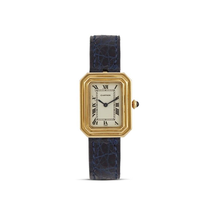 cassa di forma in oro giallo 18kt, fondello serrato con viti, corona con zaffiro cabochon, lunetta a tre scalini in oro giallo 18kt, quadrante bianco, grafica nera, numeri romani a smalto, movimento a carica manuale, cinturino originale in pelle nera, lungh. interna cm 18, fibbia deployant in oro giallo 18kt firmata Cartier, vetro minerale, gr. 34. Dim. mm 24x30. Corredato di scatola.