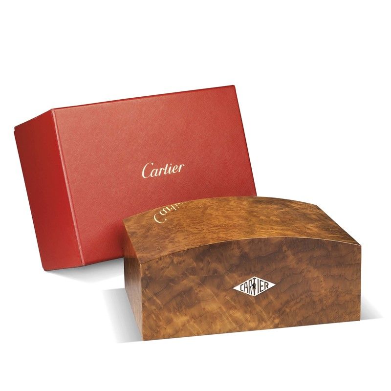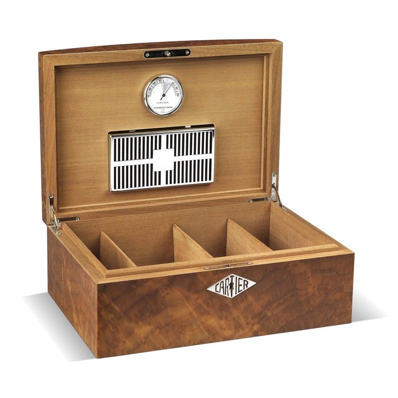 CARTIER SCATOLA PORTASIGARI "HUMIDOR FOR 75 CIGARS" EDIZIONE LIMITATA 0303/1000 scatola in radica, scritta "cartier" sulla chiusura e n. 0303/1000, dim. cm 33x22,5x14 circa. Corredato di scatola "Cartier", chiavetta, garanzia e istruzioni per l'uso.