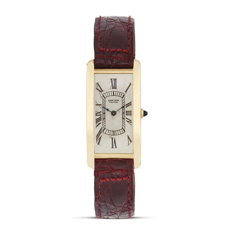 cassa di forma rettangolare in oro giallo 18kt, fondello serrato con viti recante personalizzazione con dedica e anno, fondello interno marcato European Watch and clock Co., corona con zaffiro cabochon, quadrante argenté firmato Cartier France, grafica nera, numeri romani a smalto, movimento a carica manuale marcato European Watch Co. n. 32340, cinturino non originale in pelle marrone, fibbia deployant in oro giallo 18kt non marcata, vetro ricurvo, gr. 43. Dim. mm 23x42