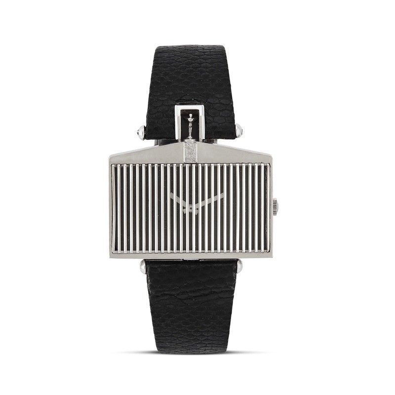 CORUM ROLLS ROYCE REF. 55585 N. 3180XX cassa di forma in oro bianco 18kt, fondello serrato con viti, corona marcata, quadrante nero sormontato da struttura a radiatore Rolls Royce, ansa superiore sormontata dalla silhouette Spirit of Ecstasy, movimento a carica manuale, cinturino originale in pelle nera, fibbia in oro bianco 18kt, gr. 47. Dim. mm 40x29.