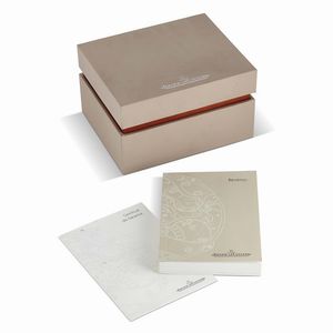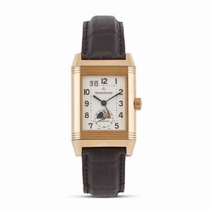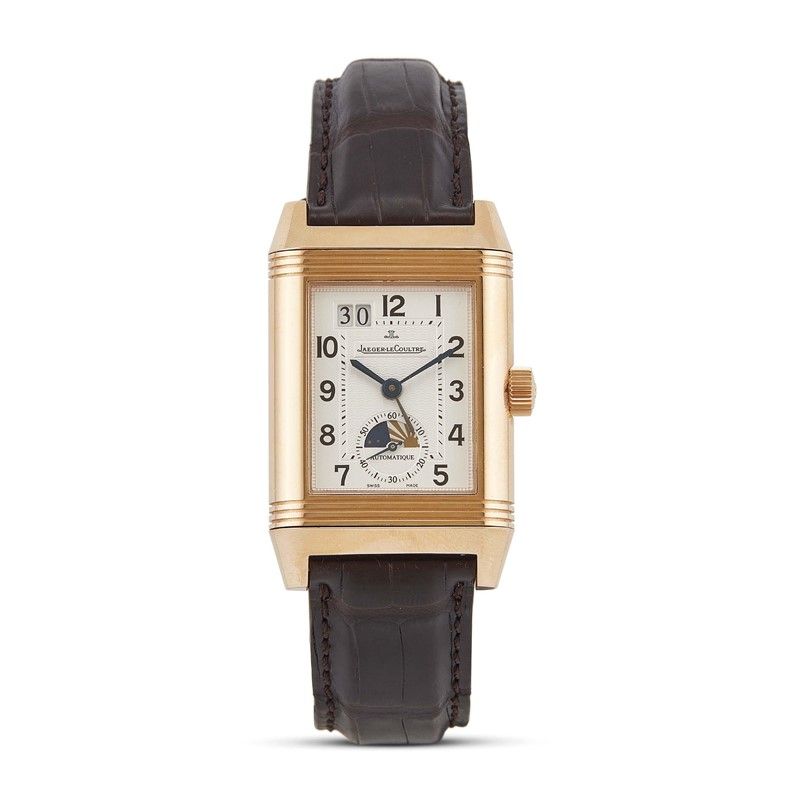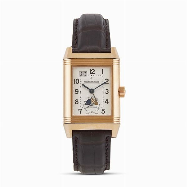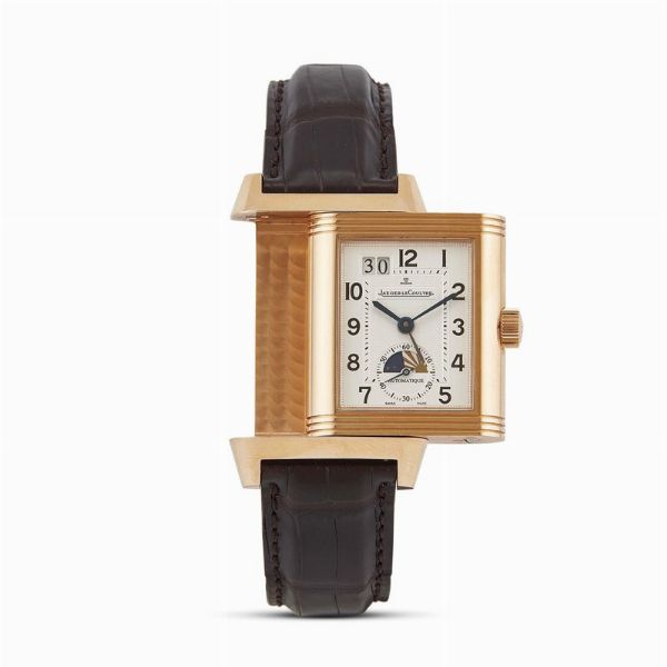 cassa di forma rettangolare in oro rosa 18kt con sistema a scorrimento e alloggio in oro rosa, quadrante argenté guilloché con fasi lunari e data a ore undici, grafica di colore nero, numeri arabi stampati, secondi a ore sei, movimento a carica automatica, cinturino originale in pelle marrone, chiusura deployant in oro rosa 18kt marcata Jaeger LeCoultre, vetro minerale, gr. 128. Dim. mm 28x47. Corredato di scatola e garanzia.