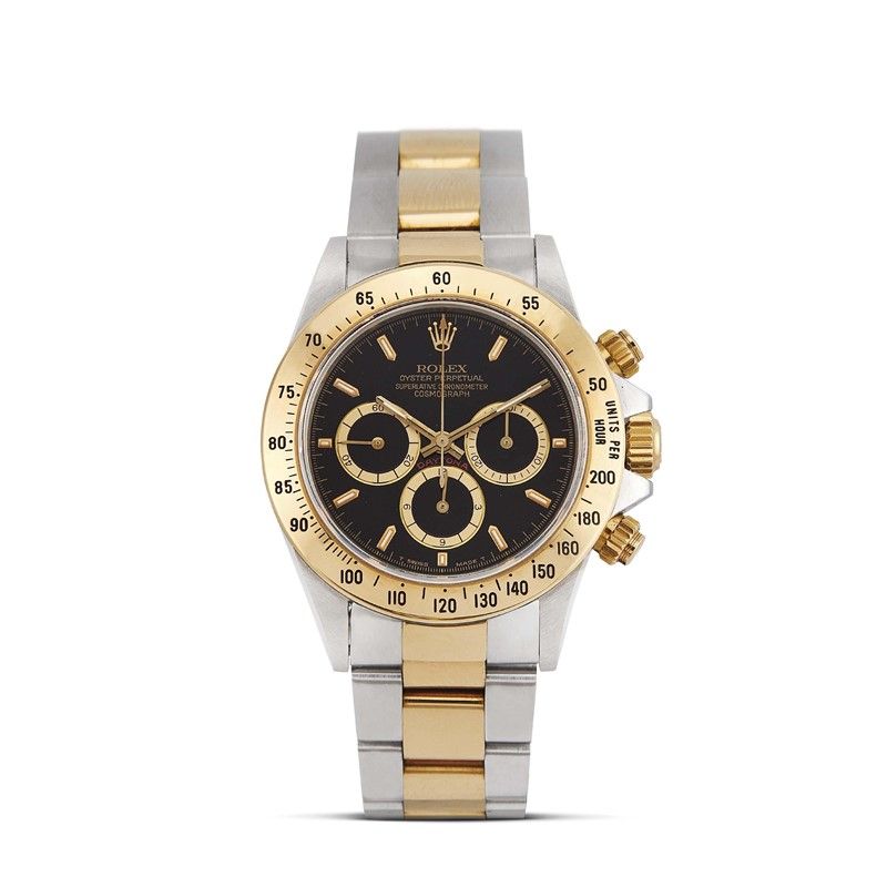 cassa in acciaio, fondello serrato a vite, corona marcata e pulsanti a vite, ghiera in oro giallo con scala tachimetrica a 200, quadrante nero con contatori champagne, grafica oro, indici applicati al trizio, contatore dei secondi a ore nove, contatore dei minuti a ore tre, contatore delle ore alle sei, movimento a carica automatica, bracciale oyster a maglie piene in acciaio e oro ref. 78363 cod. produzione N9, lungh. interna cm 19, chiusura a scatoletta in acciaio marcata Rolex, vetro minerale. Diam. mm 40. Corredato di scatola, controscatola e garanzia.