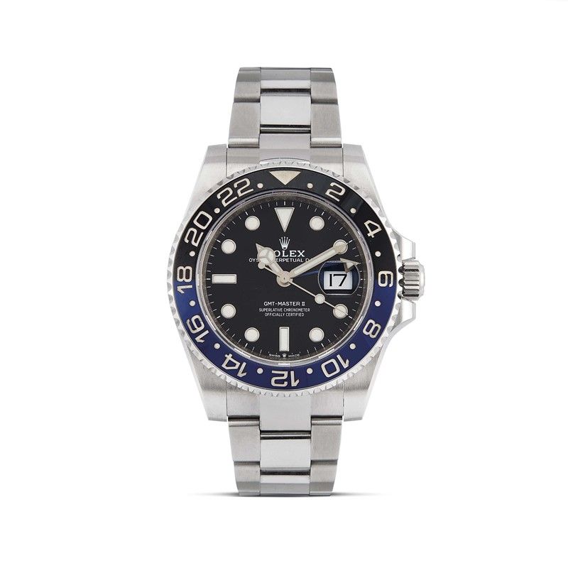 cassa in acciaio, fondello serrato a vite, ghiera in acciaio con inserto "Batman" in ceramica, grafica bianca, quadrante nero con bicchierini al superluminova, datario a ore tre con lente cyclope, movimento a carica automatica, bracciale oyster a maglie piene in acciaio satinato e lucido, lungh. interna cm 20, cod. produzione R3Q, chiusura a scatoletta marcata Rolex, vetro minerale. Diam. mm 40. Corredato di scatola, controscatola, garanzia libretto e una maglia aggiuntiva. Condizioni pari al nuovo.