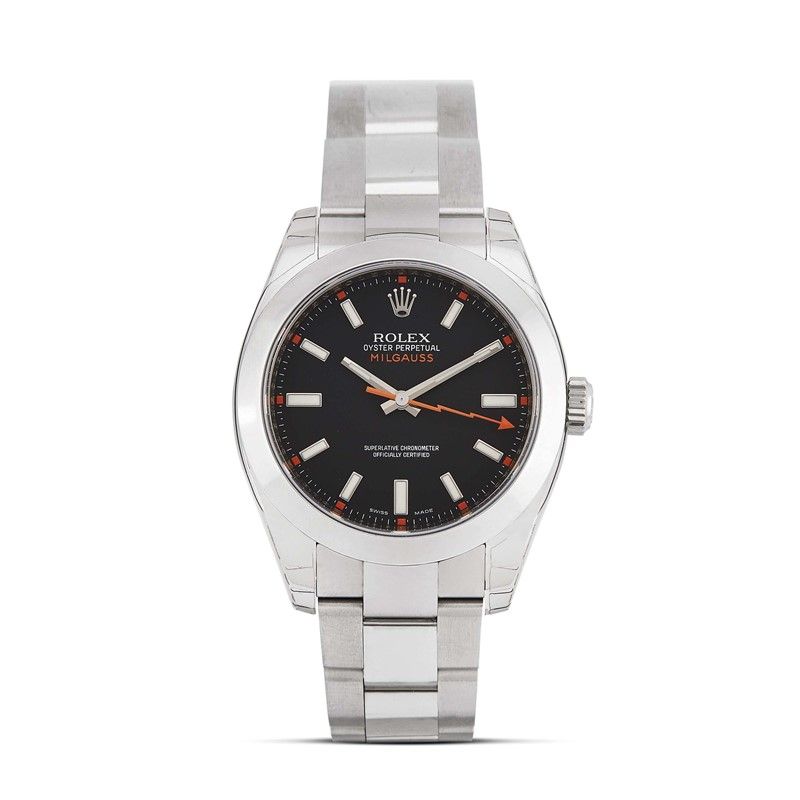 cassa in acciaio, fondello serrato a vite, lunetta liscia in acciaio, corona marcata, quadrante nero con indici applicati al superluminova, grafica bianca, scritta Milgauss in arancio e sfera dei secondi a saetta, movimento a carica automatica, bracciale oyster a maglie piene satinate e lucide con finali E010, lungh. interna cm 19 circa, chiusura a scatoletta marcata Rolex, vetro minerale bianco. Diam mm 40. Corredato di scatola, controscatola, libretto, garanzia e una maglia aggiutiva. Pellicole presenti. Condizioni pari al nuovo.