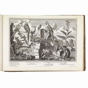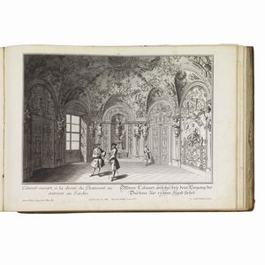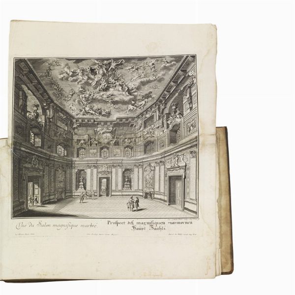 Esemplare non completo contenente 9 tavole calcografiche di testo e 67 tavole calcografiche con illustrazioni, ovvero: dedica, 8 frontespizi (Suitte des Residences Memorables seconda-settima parte, 1733-1737, Representations Des Animaux de la Menagerie, 1734), e poi 63 tavole contrassegnate in alto da numeri romani in sequenza: I - 9 tavole di animali, II-IV - 9 9 9 tavole d’interni, V- 9 tavole d’esterni (incluse una pianta ripiegata e 4 tavole a doppia pagina), VI - 9 tavole di cancelli e giardini, VII - 9 tavole di giardini (fontane ecc.), più, in fine, altre 4 tavole: una grande tavola ripiegata numerata “9” con la “Vue du Salon magnifique marbré” (strappo restaurato al verso), una grande tavola ripiegata numerata “3” con la “Vue du jardin et des Batimens” (strappo alla piegatura e restauri al dorso), una tavola doppia numerata “2” con il “Plan du jardin des Batimens”, e una tavola numerata “4” con “Deux plans de l’edifice principal” (un po’ gualcita e pallidamente fiorita). -- Prime due tavole gualcite e con gora marginale, che prosegue più pallida sulle tavole successive, pallida gora marginale alle ultime tavole. In folio oblungo in vitellino coevo (sciupato, piatto anteriore staccato).